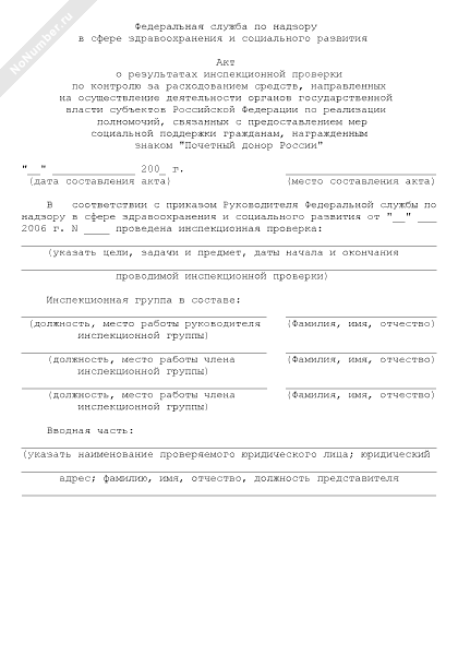 - 770Акт о результатах инспекционной проверки по контролю за расходованием средств, направленных на осуществление деятельности органов государственной власти субъектов Российской Федерации по реализации полномочий, связанных с предоставлением мер социальной поддержки гражданам, награжденных знаком «Почетный донор России»