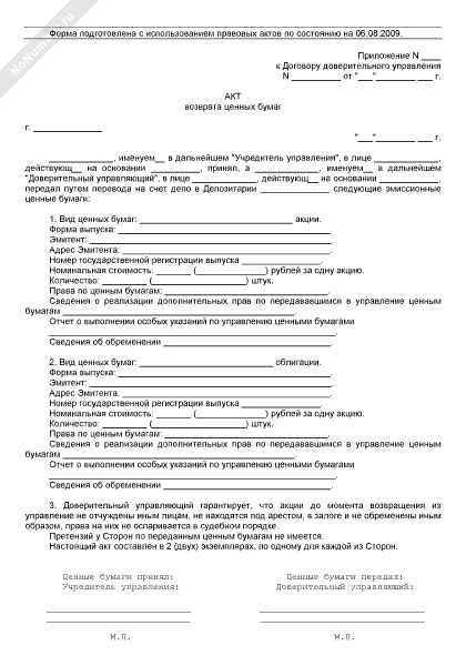 - 61Акт возврата ценных бумаг (приложение к договору доверительного управления правами, предоставляемыми эмиссионными ценными бумагами, без права отчуждения ценных бумаг (доверительный управляющий — непрофессиональный участник рынка ценных бумаг))