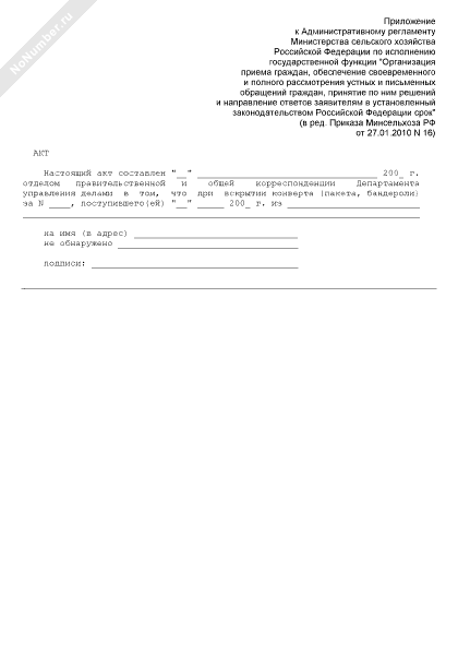 - 68Акт вскрытия конверта (пакета, бандероли), поступившего(ей) в отдел правительственной и общей корреспонденции Департамента государственной службы и управления делами Министерства сельского хозяйства Российской Федерации