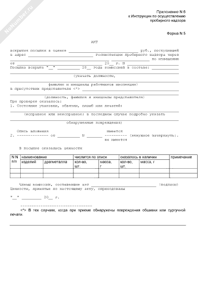 - 69Акт вскрытия посылки, поступившей в адрес Госинспекции пробирного надзора по извещению (форма № 5)