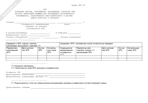 - 66Акт вскрытия вагона, контейнера, автомобиля, трактора или другой самоходной машины для проведения пограничного, таможенного, карантинного фитосанитарного и других видов контроля и проверок (форма № ИНУ-49)