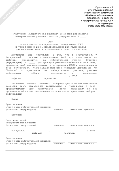 - 77Акт выдачи дискет для проведения тестирования с использованием комплексов обработки избирательных бюллетеней и тренировки в день, предшествующий дню голосования (тестирования с использованием комплексов обработки избирательных бюллетеней и голосования в день голосования) на выборах и референдумах, проводимых на территории Российской Федерации