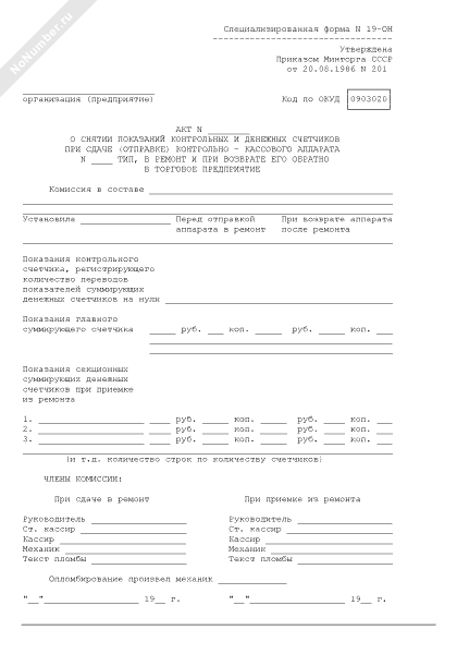- 804Акт о снятии показаний контрольных и денежных счетчиков при сдаче (отправке) контрольно-кассового аппарата в ремонт и при возврате его обратно в торговое предприятие. Специализированная форма № 19-ОН