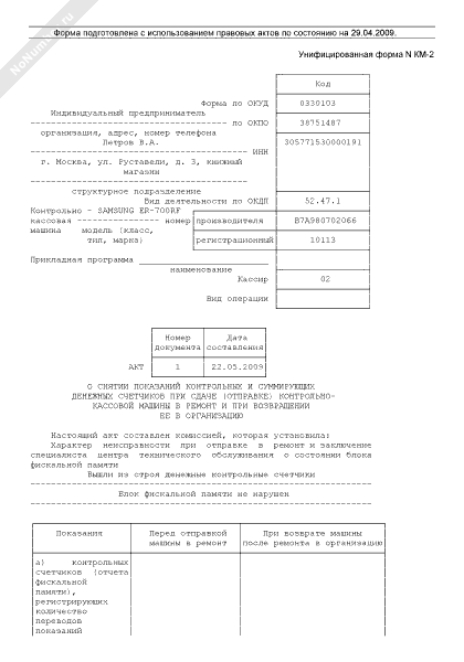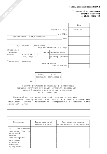 - 806Акт о снятии показаний контрольных и суммирующих денежных счетчиков при сдаче (отправке) контрольно-кассовой машины в ремонт и при возвращении ее в организацию (унифицированная форма № КМ-2)