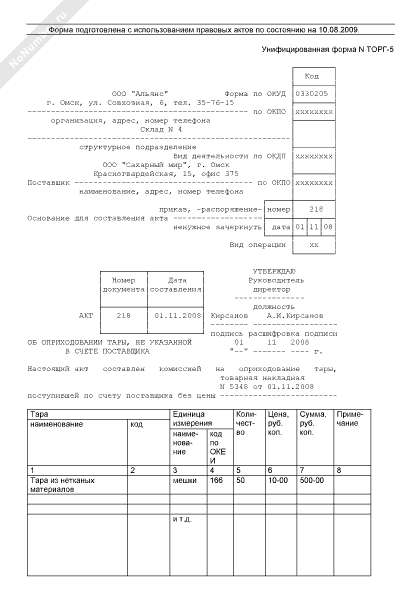 - 941Акт об оприходовании тары, не указанной в счете поставщика (унифицированная форма № ТОРГ-5)