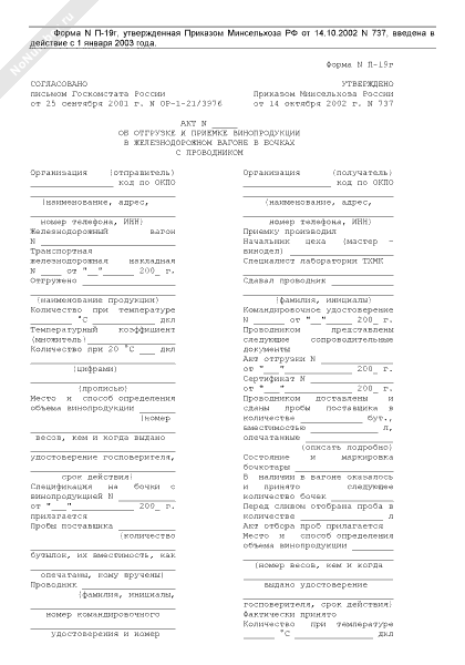 - 949Акт об отгрузке и приемке винопродукции в железнодорожном вагоне в бочках с проводником (форма № П-19г)