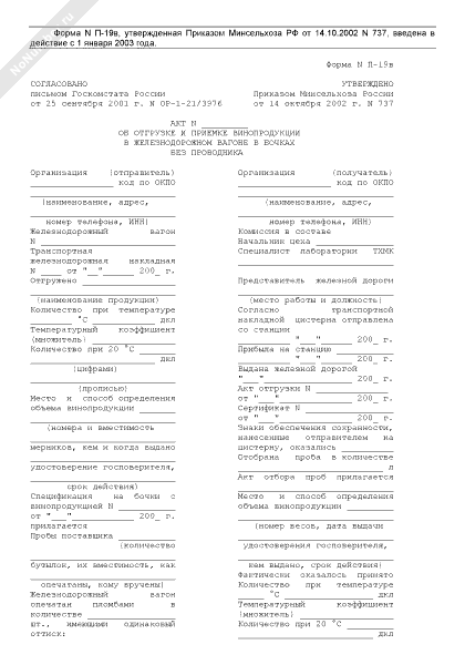 - 948Акт об отгрузке и приемке винопродукции в железнодорожном вагоне в бочках без проводника (форма № П-19в)
