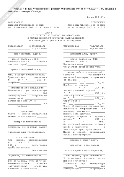 - 946Акт об отгрузке и приемке винопродукции в железнодорожной цистерне (автоцистерне) без проводника (водителя-экспедитора) (форма № П-19а)