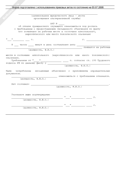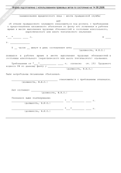 - 953Акт об отказе гражданского служащего ознакомиться под роспись с требованием о предоставлении письменного объяснения по факту его появления на рабочем месте в состоянии алкогольного, наркотического или иного токсического опьянения
