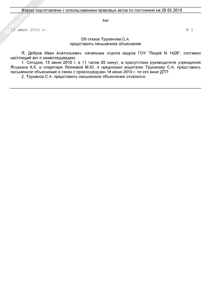 - 951Акт об отказе водителя организации представить письменное объяснение в связи с произошедшим по его вине дорожно-транспортным происшествием