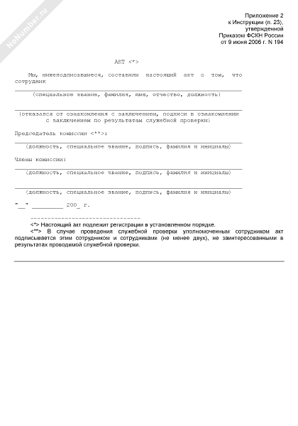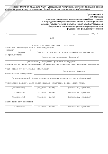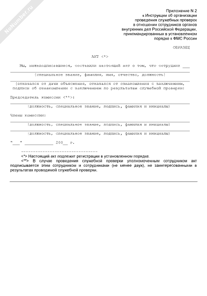 - 1010Акт об отказе сотрудника органов внутренних дел Российской Федерации, прикомандированного к Федеральной миграционной службе России от дачи объяснения (от ознакомления с заключением, от подписи об ознакомлении с заключением) по результатам служебной проверки