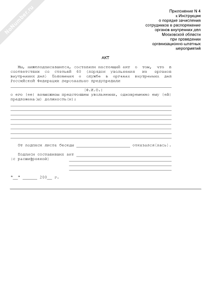 - 1011Акт об отказе сотрудника органа внутренних дел от подписания листа собеседования о его возможном предстоящем увольнении