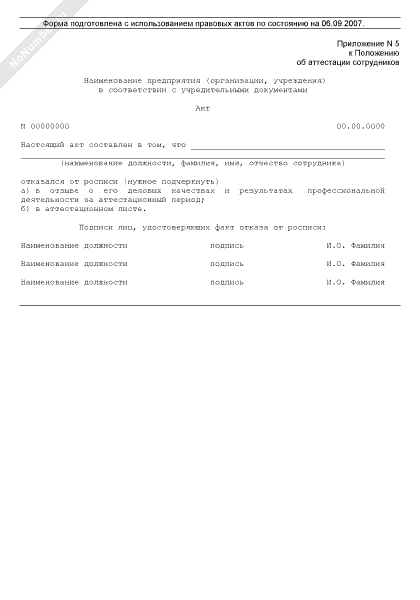 - 1013Акт об отказе сотрудника от росписи в отзыве о его деловых качествах и результатах профессиональной деятельности (в аттестационном листе) (приложение к положению об аттестации сотрудников)