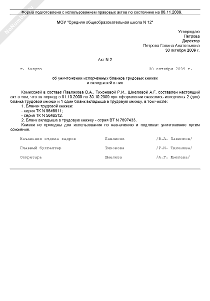 - 1073Акт об уничтожении испорченных бланков трудовых книжек