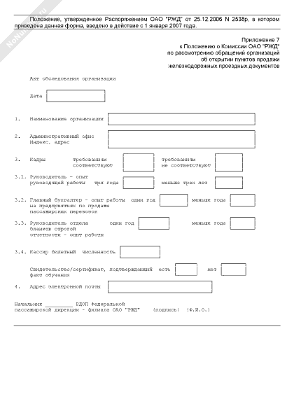 - 1131Акт обследования организации, заявляющей о наделении ее правом реализации железнодорожных проездных документов