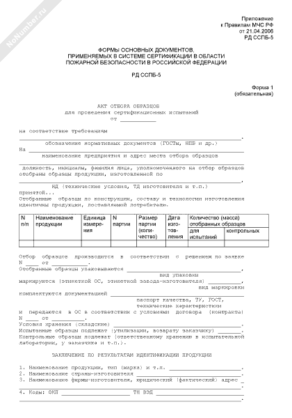- 1303Акт отбора образцов для проведения сертификационных испытаний в области пожарной безопасности в Российской Федерации (форма № 1) (обязательная)