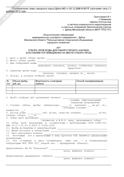 - 1313Акт отбора проб воды для лабораторного анализа (составляется немедленно на месте отбора проб) на территории г. Дубны Московской области
