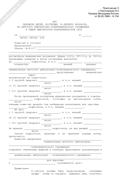 - 1366Акт передачи детей, достигших 18-летнего возраста, из детского амбулаторно-поликлинического учреждения в общую амбулаторно-поликлиническую сеть