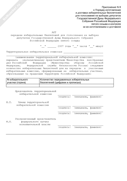 - 1380Акт передачи избирательных бюллетеней для голосования на выборах депутатов Государственной Думы Федерального Собрания Российской Федерации пятого созыва уполномоченными представителями Министерства иностранных дел Российской Федерации в участковые избирательные комиссии, сформированные на избирательных участках, образованных за пределами территории Российской Федерации