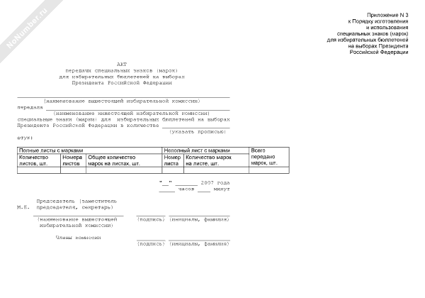 - 1364Акт передачи вышестоящей избирательной комиссией нижестоящей комиссии специальных знаков (марок) для избирательных бюллетеней на выборах Президента Российской Федерации