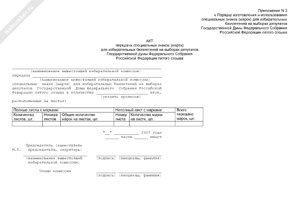 - 1363Акт передачи вышестоящей избирательной комиссии нижестоящей избирательной комиссии специальных знаков (марок) для избирательных бюллетеней на выборах депутатов Государственной думы Федерального Собрания Российской Федерации пятого созыва