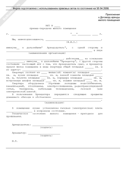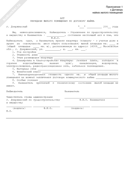 - 1372Акт передачи жилого помещения по договору найма (приложение к договору найма жилого помещения на территории городского округа Дзержинский Московской области)