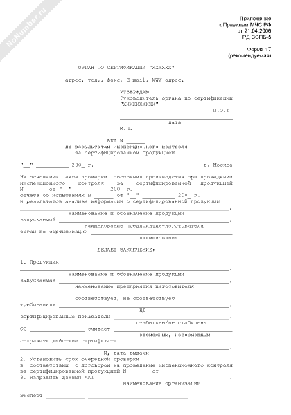 - 1448Акт по результатам инспекционного контроля за сертифицированной продукцией в области пожарной безопасности в Российской Федерации (форма № 17, рекомендуемая)