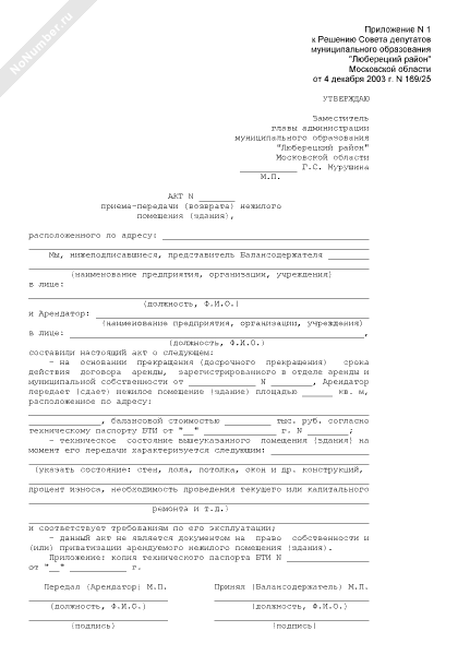 - 1530Акт приема-передачи (возврата) нежилого помещения (здания), являющегося собственностью муниципального образования «Люберецкий район» Московской области, на основании прекращения (досрочного прекращения) срока действия договора аренды