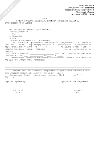 - 1523Акт приема-передачи (возврата) нежилого помещения (здания) на территории городского поселения Томилино Московской области