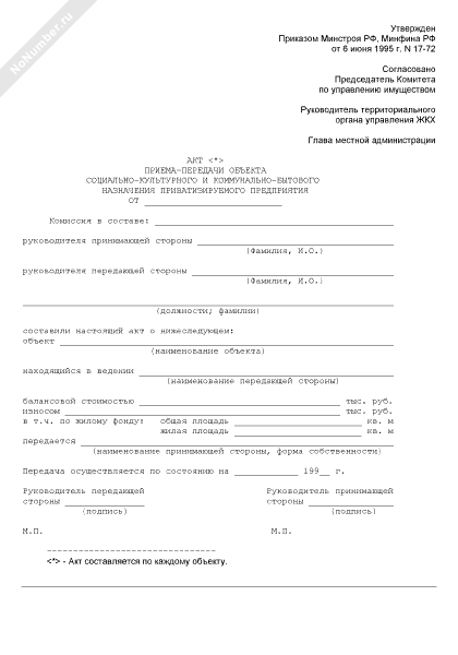 - 1531Акт приема-передачи объекта социально-культурного и коммунально-бытового назначения приватизируемого предприятия