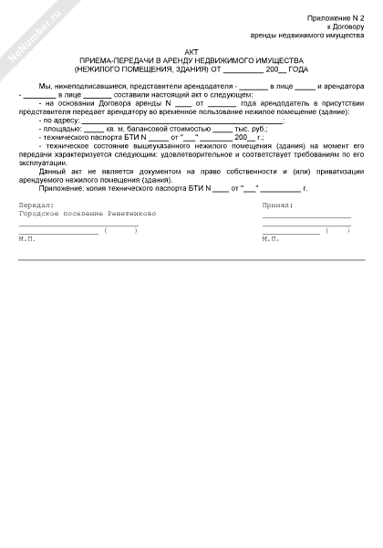 - 1528Акт приема-передачи в аренду недвижимого имущества (нежилого помещения, здания) (приложение к договору аренды недвижимого имущества городского поселения Решетниково Московской области)