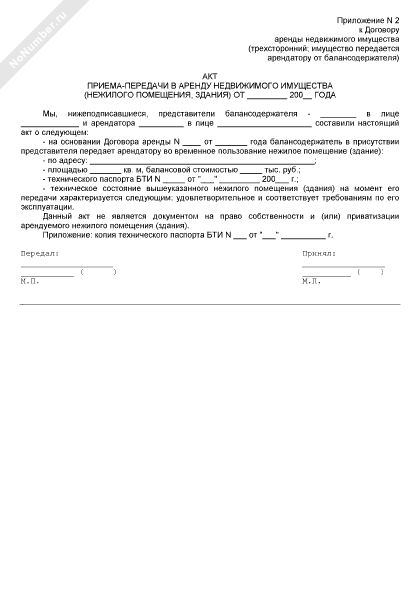 - 1527Акт приема-передачи в аренду недвижимого имущества (нежилого помещения, здания) (приложение к договору аренды недвижимого имущества городского поселения Решетниково Московской области (трехстороннему; имущество передается арендатору от балансодержателя))