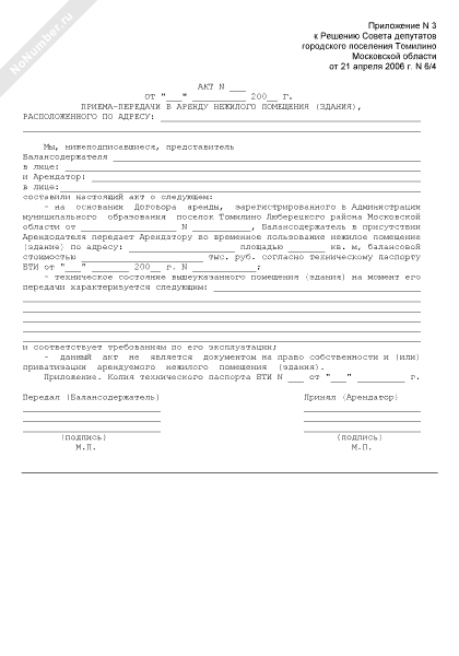 - 1522Акт приема-передачи в аренду нежилого помещения (здания) на территории городского поселения Томилино Московской области