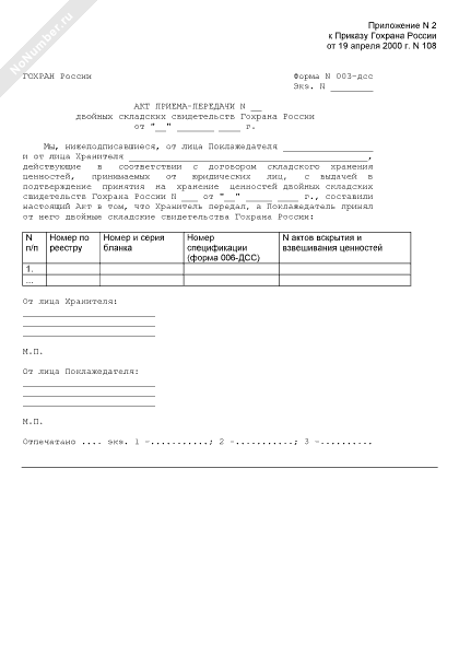 - 1555Акт приема-передачи двойных складских свидетельств Гохрана России (форма № 003-дсс)
