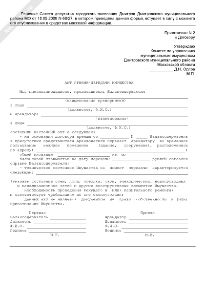 - 1556Акт приема-передачи имущества (приложение к договору аренды движимого муниципального имущества городского поселения Дмитров Дмитровского муниципального района Московской области)
