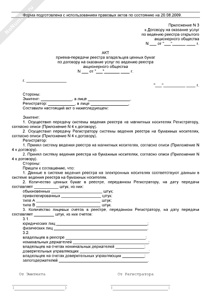 - 1546Акт приема-передачи реестра владельцев ценных бумаг по договору на оказание услуг по ведению реестра акционерного общества