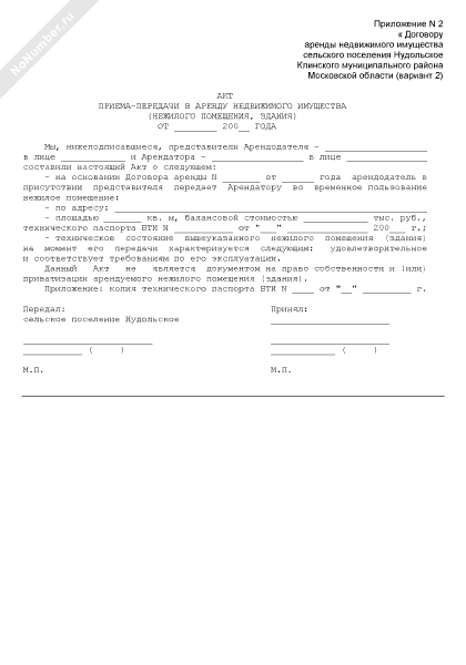 - 1664Акт приема-передачи в аренду недвижимого имущества (нежилого помещения, здания) (приложение к договору аренды недвижимого имущества сельского поселения Нудольское Клинского муниципального района Московской области (вариант 2))