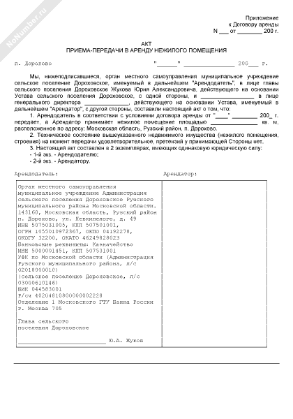 - 1665Акт приема-передачи в аренду нежилого помещения (приложение к договору аренды нежилого помещения на территории сельского поселения Дороховское Рузского района Московской области)