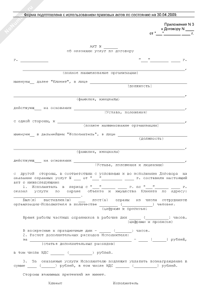 Акт об оказании услуг (приложение к договору на оказание охранных услуг)