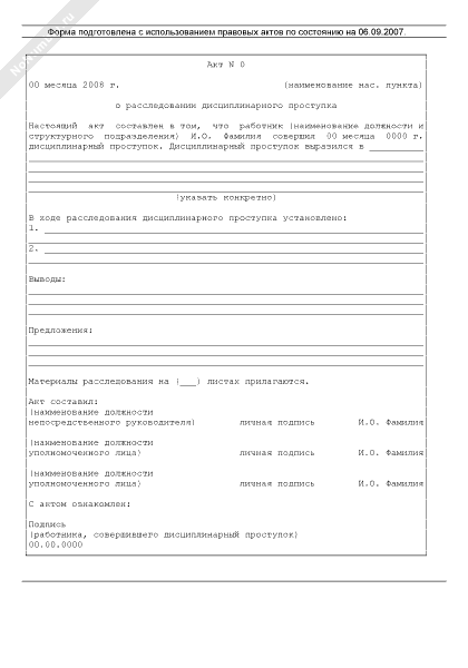 Акт о расследовании дисциплинарного проступка работника