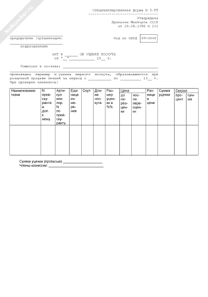 Акт об уценке лоскута. Специализированная форма № 5-РТ