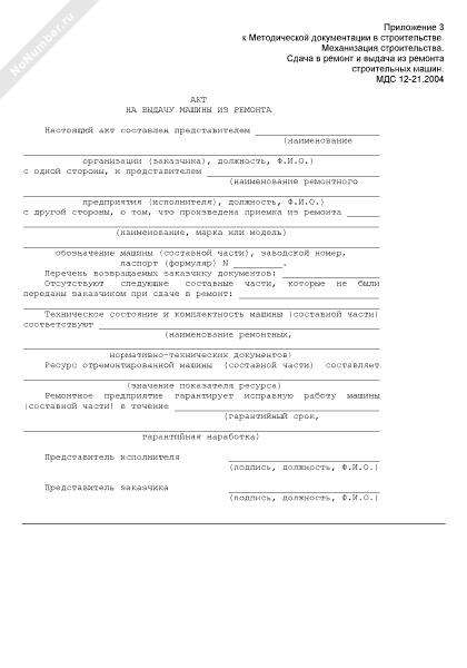 Акт приемки перегрузочной машины из ремонта (форма № 7)