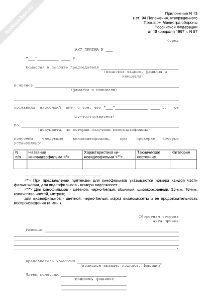 Акт приема киновидеофильмов, полученных войсковой частью (рекомендуемый образец заполнения)