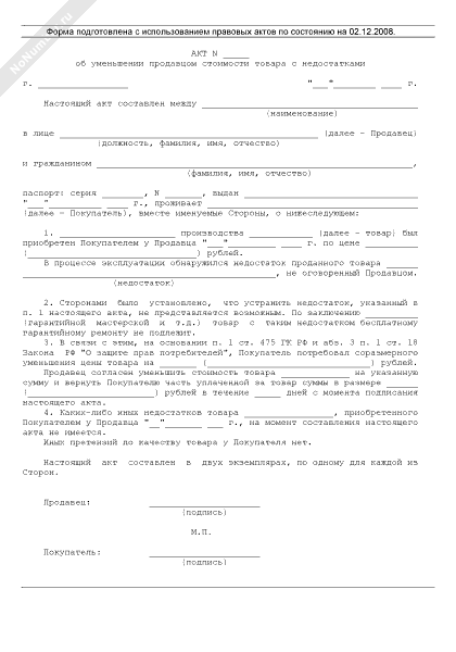 Акт об уменьшении продавцом стоимости товара с недостатками