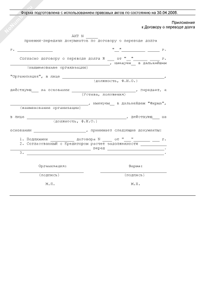 Акт приемки-передачи документов (приложение к договору о переводе долга)