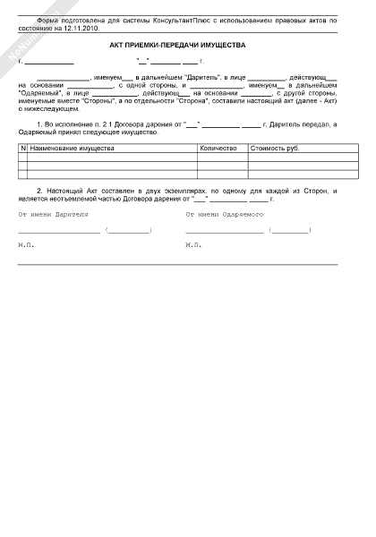 Акт приемки-передачи имущества (приложение к договору дарения)