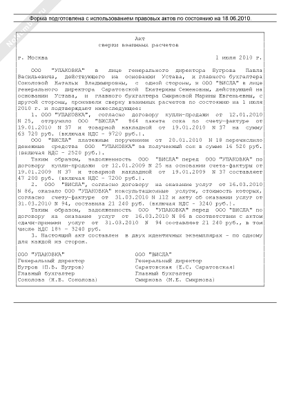 Акт сверки расчетов с контрагентом (рекомендуемый образец заполнения)