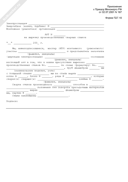 Акт на вырезку производственных сварных стыков (форма № П27.10)