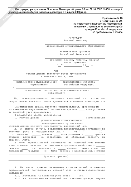 Акт сверки данных воинского учета призывников в военном комиссариате