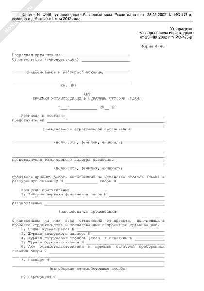Акт приемки установленных в скважины столбов (свай) (форма № Ф-46)